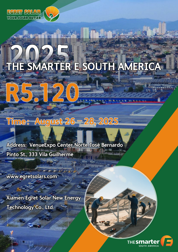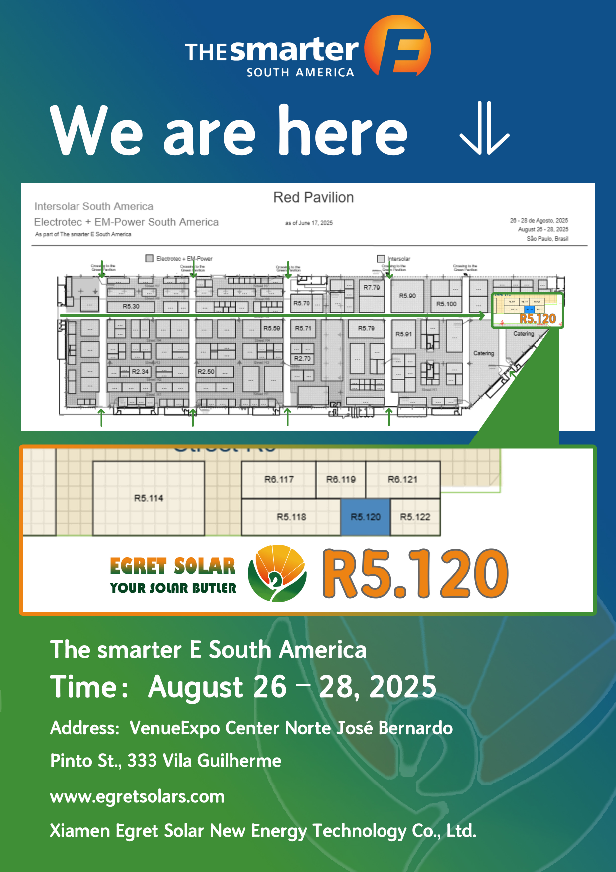 Som en nøglespiller i den nye energisektor,Xiamen Egret Solar New Energy Technology Co., Ltd.vil vise sine kerneprodukter og tekniske løsninger på den smartere e Sydamerika 2025-udstilling i Brasilien fra 26. til 28. august 2025 for at diskutere udviklingen og samarbejdet på det sydamerikanske nye energimarked med globale branchepartnere.