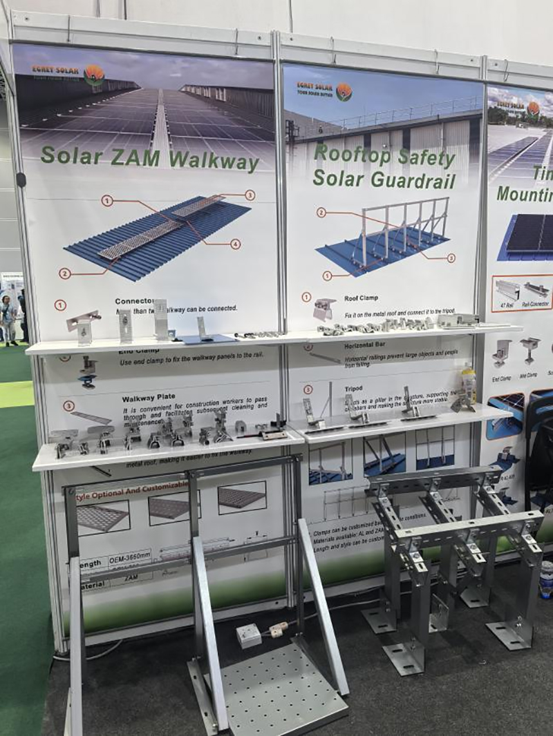 På udstillingen viste vi flere tagtilbehør, herunder klemmer, kroge og L-fødder. Kunder kan vælge forskellige kombinationer baseret på deres installationsmiljø. Klemmer eller L-fødder bruges til farvebelagte ståltegl, mens tagstenskrog solar bruges til keramiske fliser. Vi kan også tilpasse klemmer baseret på kundens farvebelagte stålflisemodel eller forlænge krogens arm, så de passer til brug på stedet.